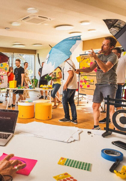 Fast-track product, service or cultural development through the BlitzPitch.This high-adrenaline team game sharpens creativity, team building, and presentation skills. Teams quickly tackle problems, brainstorm, prototype, and then stage lightning pitches. Think of it as the year's best advertising clips.Goals & Learnings: Pitch ready ideas or quick&dirty prototpyes wrapped in a show to foster communication, creativity and presentation skills while team bondingAs desired: Online, 20-250 participants, 2-4h.